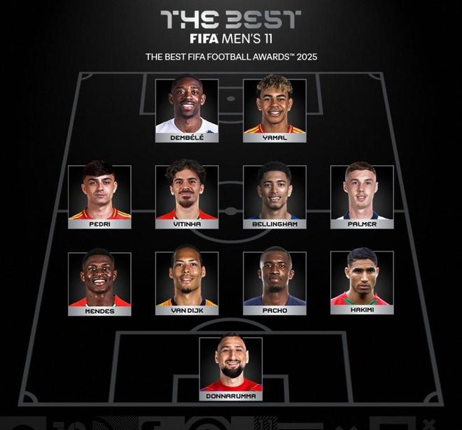男足最佳陣容則是:多納魯馬;阿什拉夫、帕喬、范戴克、門德斯;帕爾默、貝林厄姆、維蒂尼亞、佩德里;亞馬爾、登貝萊。